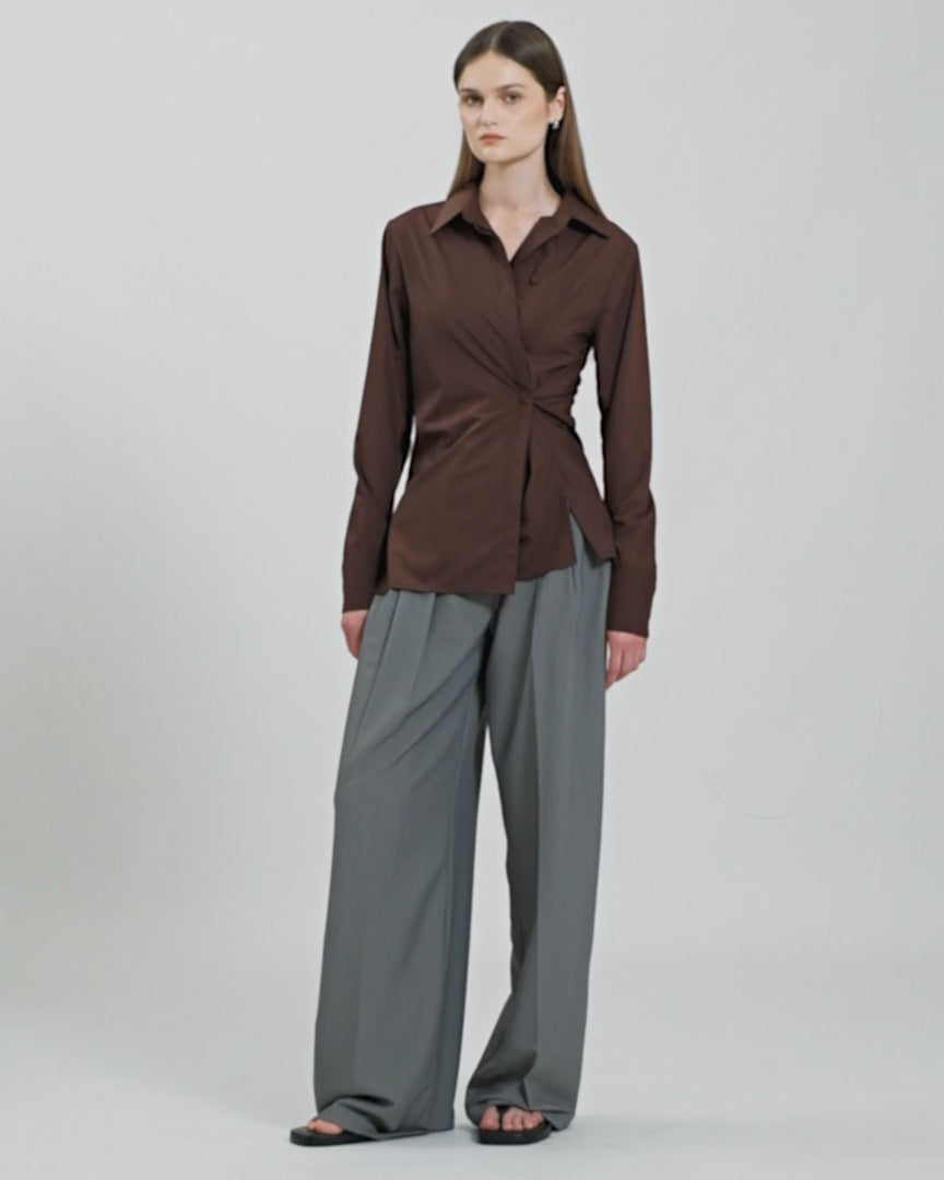 A classic shirt reimagined with a modern twist. Cut for a relaxed fit, it can be worn loose for a clean, tailored silhouette or fastened at the side for a softly draped, asymmetrical shape.
