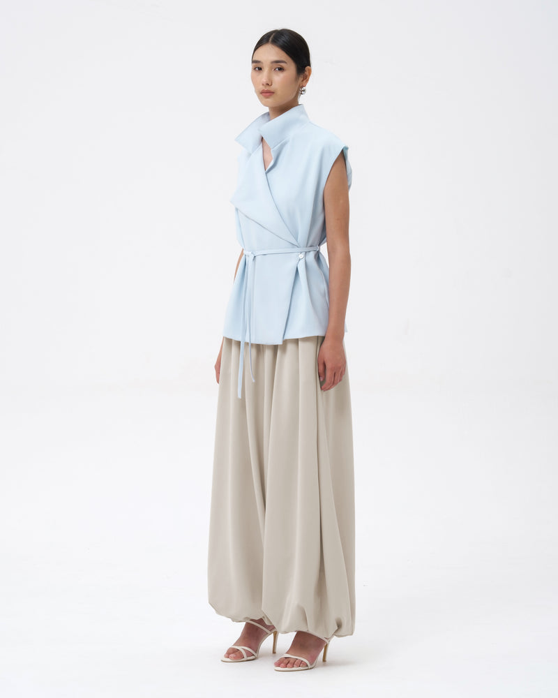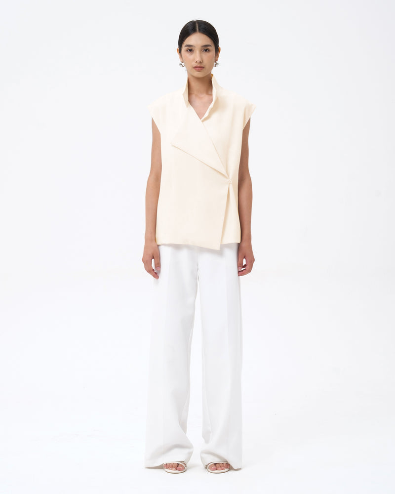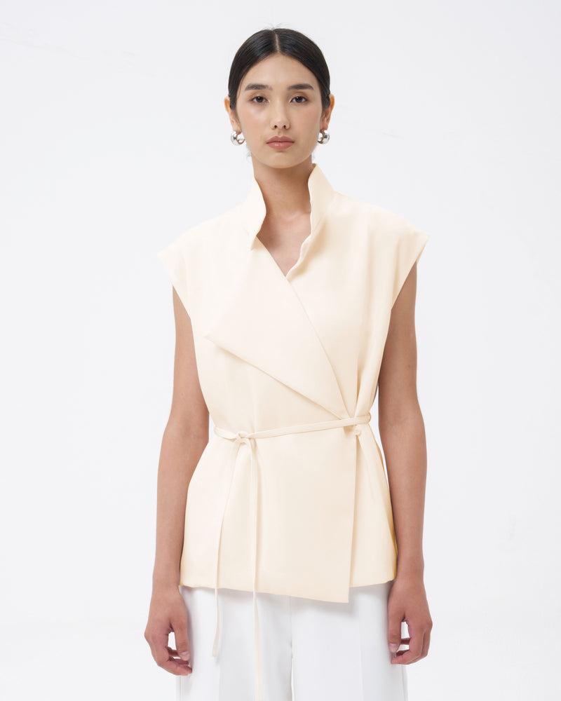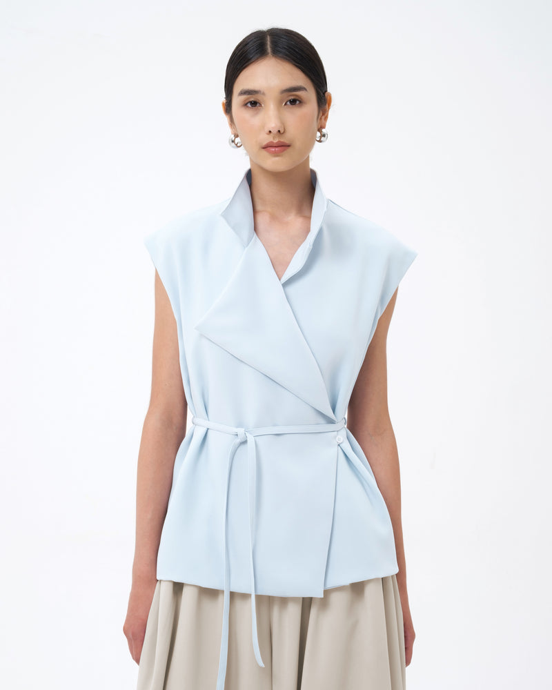 The Helena Top is a sleeveless top made from soft, flowy polyester with a breathable poly lining. It has a relaxed silhouette with an asymmetrical flap detail, and a high collar. It features a hidden button closure and a removable belt for adjustable styling.