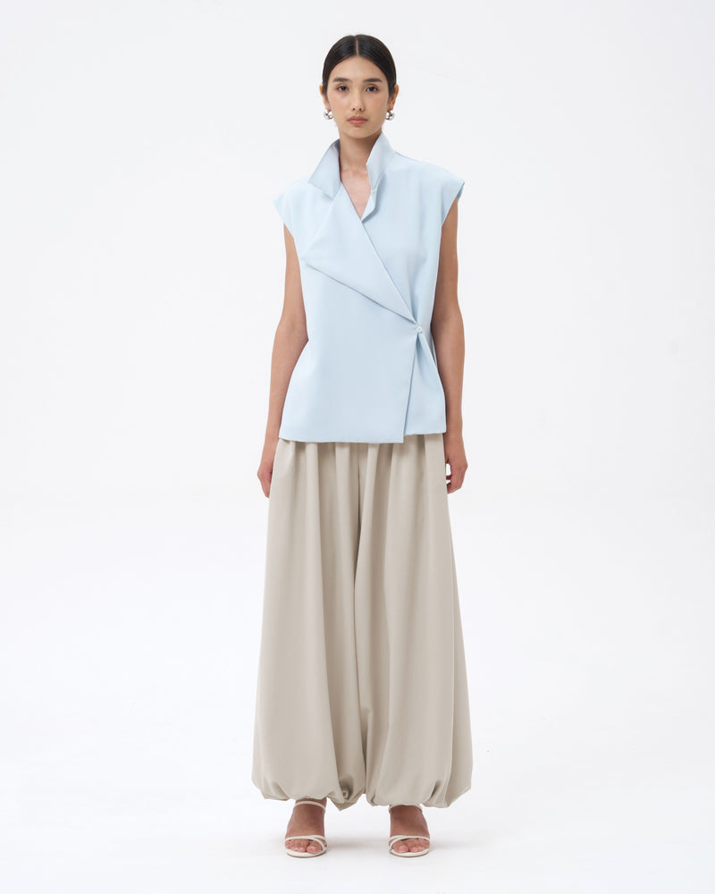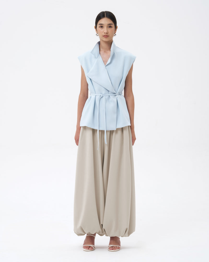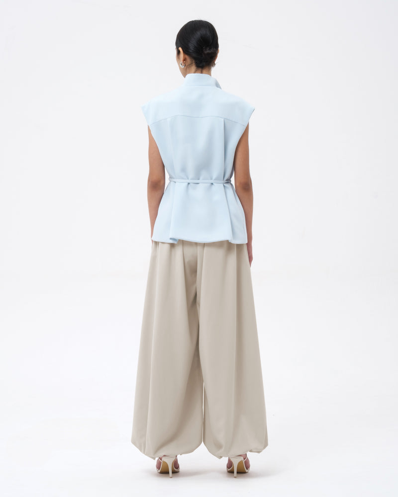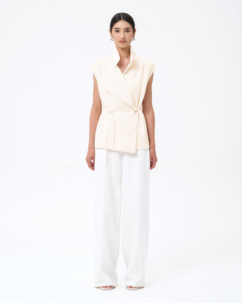 The Helena Top is a sleeveless top made from soft, flowy polyester with a breathable poly lining. It has a relaxed silhouette with an asymmetrical flap detail, and a high collar. It features a hidden button closure and a removable belt for adjustable styling.