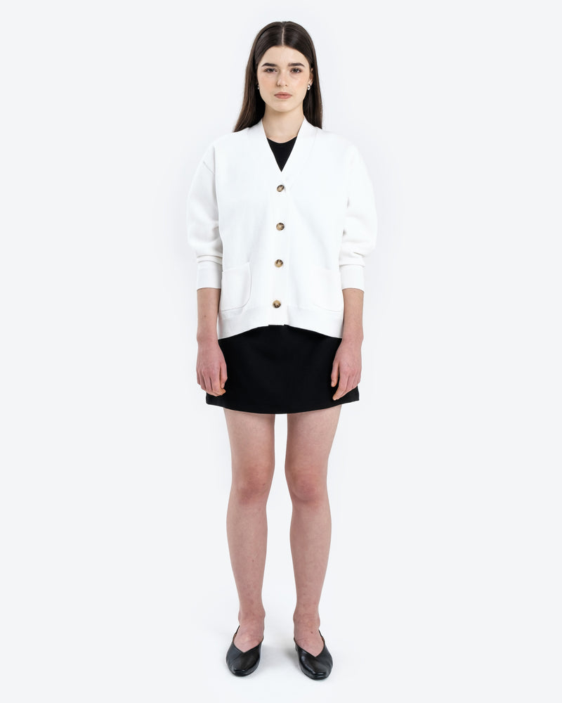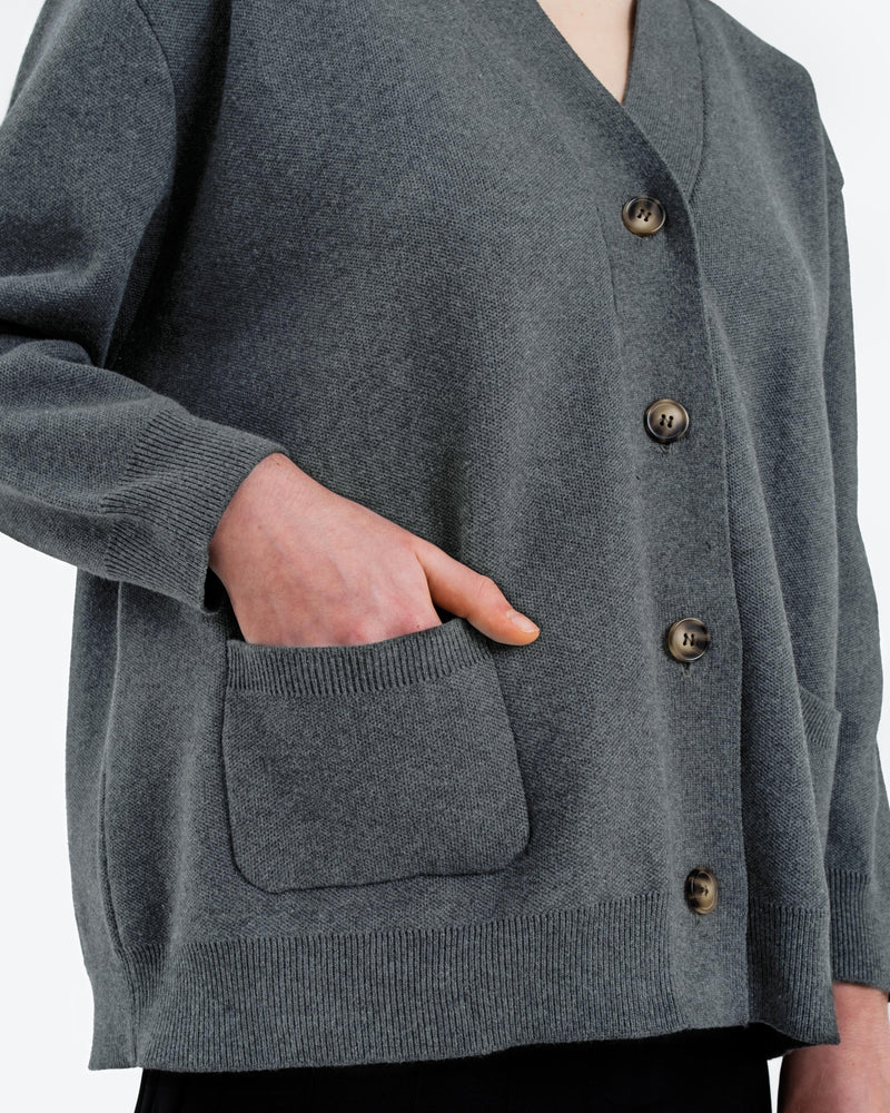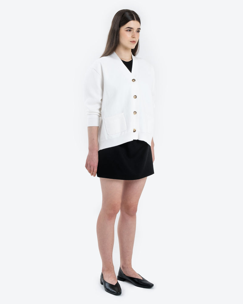 Leon Cardigan is a staple knitted cardigan. Made from cotton yarn in dense and thick knitting, it offers a luxurious feel. This cardigan is designed for an oversized fit with boxy cut, adorned with patch pockets and contrast tortoise buttons along the placket.