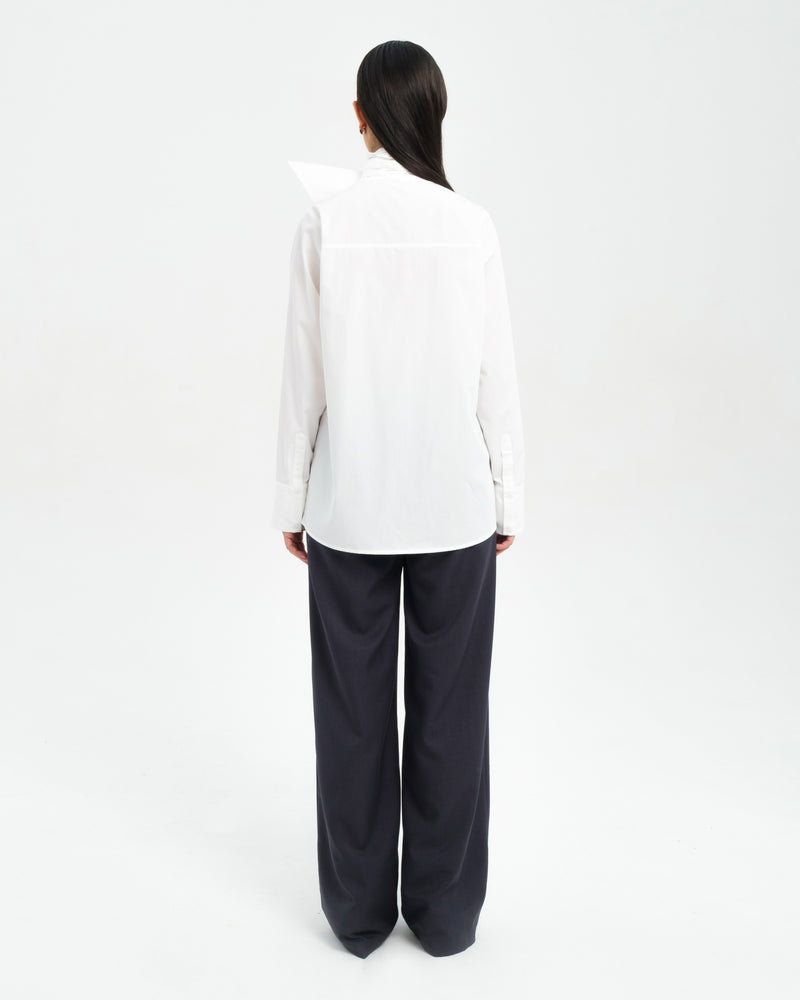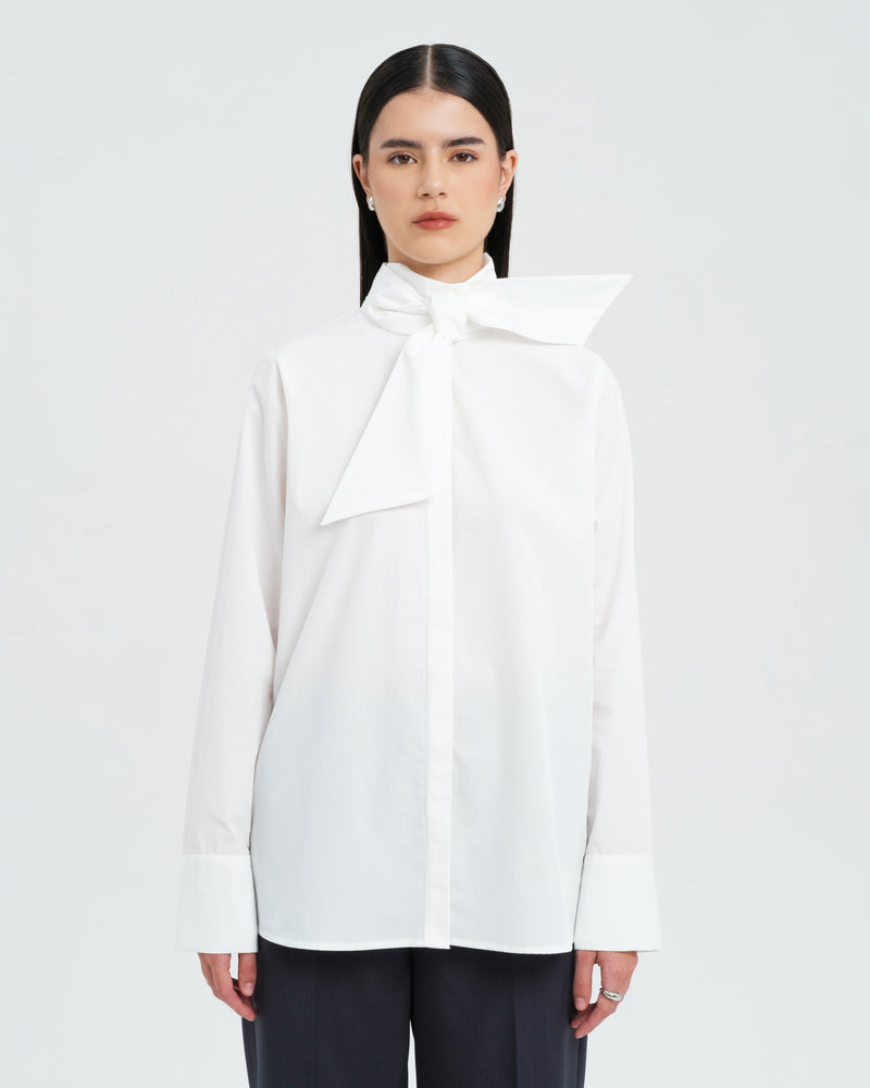 Noel Shirt features a versatile scarf tie collar that offers endless styling possibilities. This shirt now comes in 3 colors: Sheer Black, Sage Stripes, and White. Sheer black is made from sheer poly with black inner bandeau included, Sage Stripes is made from yarn-dyed cotton poly blend with lighter weight, and the classic White color is made from classic crisp cotton poly blend. Paired with your choice of bottom, this shirt is perfect for layering or standalone wear.